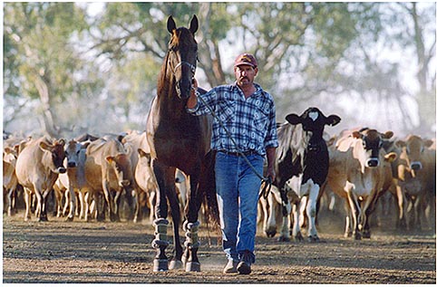 6. Koondrook dairy farmer, Peter Den Houting, and Hunter Cup runner, Jonells Son, among the cows - 12th February 2002 CRAIG HUGHES published in HERALD SUN, VICTORIA