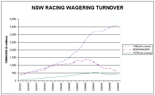 Up to around 1980, there appeared to be no reason why the established on and off-course betting regimes could not happily co-exist in New South Wales. But at the beginning of the 1980’s the fixed odds bookmaker market began to waver. The worst fears of the bookmaking industry were realised in 1982/83 when, for the first time in history, legal bookmaking turnover in New South Wales actually went into decline.