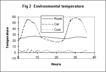 The environmental temperatures that the semen containers were subjected too can be visualized in Figure 2. Car temperatures exceeded 500C for hours during the hottest part of the day, however room temperature and the cool room were quite stable.
