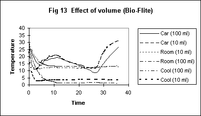 This experiment suggests that larger volumes appear to be less susceptible to variations in outside temperature and in higher temperatures large volumes tended to heat slower, reach lower maximum temperatures, cool quicker and maintain better progressive motility than small volumes.