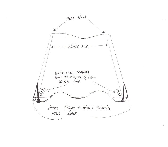 White-line trauma is generally caused by shoes being left on too long and the hoof wall then growing over the shoes, forcing the wall away from the soft tissue. Such trauma would be comparable to putting a knife under your fingernail and lifting the nail away from the sensitive tissue.
