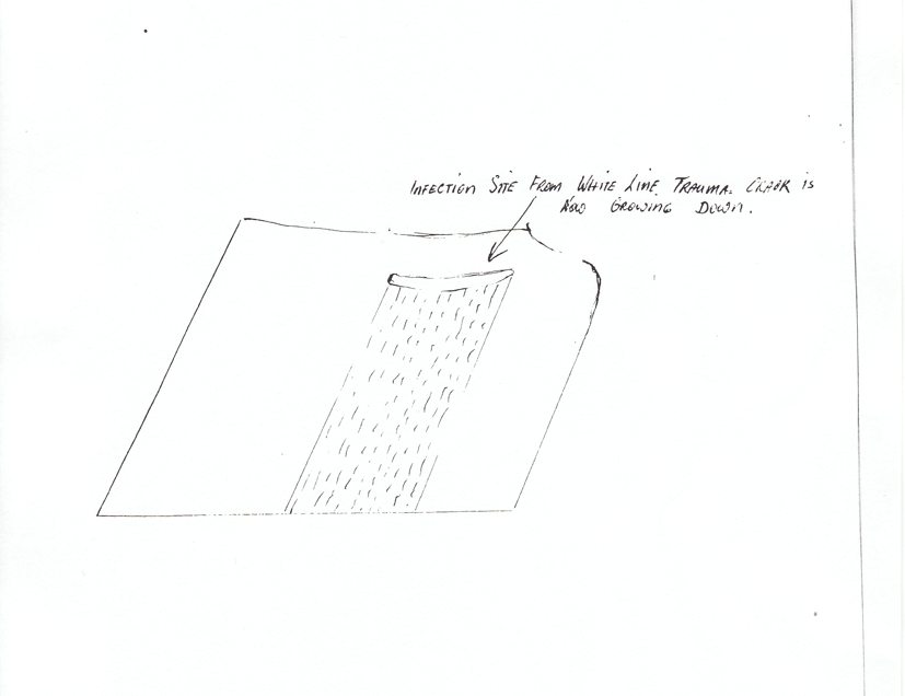 For example, with white line trauma the hard insensitive lanama starts to tear away causing the sensitive tissue to stress. This continues until a small crack develops in the white line and fills with foreign matter usually working its way further up into the white line. Eventually the horse will show some lameness especially if the hoof infects. The infection will generally continue to force its way up the hoof in the white line until it breaks out in the coronary band. Even when the infection has been cleared up you then have a fractured hoof wall that will take months to grow out.