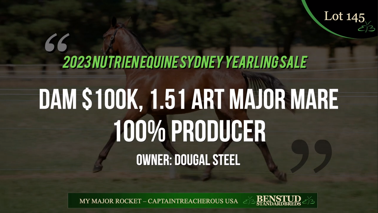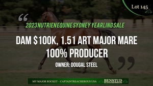 Lot 145 in the upcoming Nutrien Equine Sydney yearling sale combines the genes of a classic Australasian family with young North American siring superstar Captaintreacherous. From talented Art Major mare My Major Rocket (1.51.6), he is a classy colt, nurtured from conception by Craig Judd and his expert team at Benstud NSW.