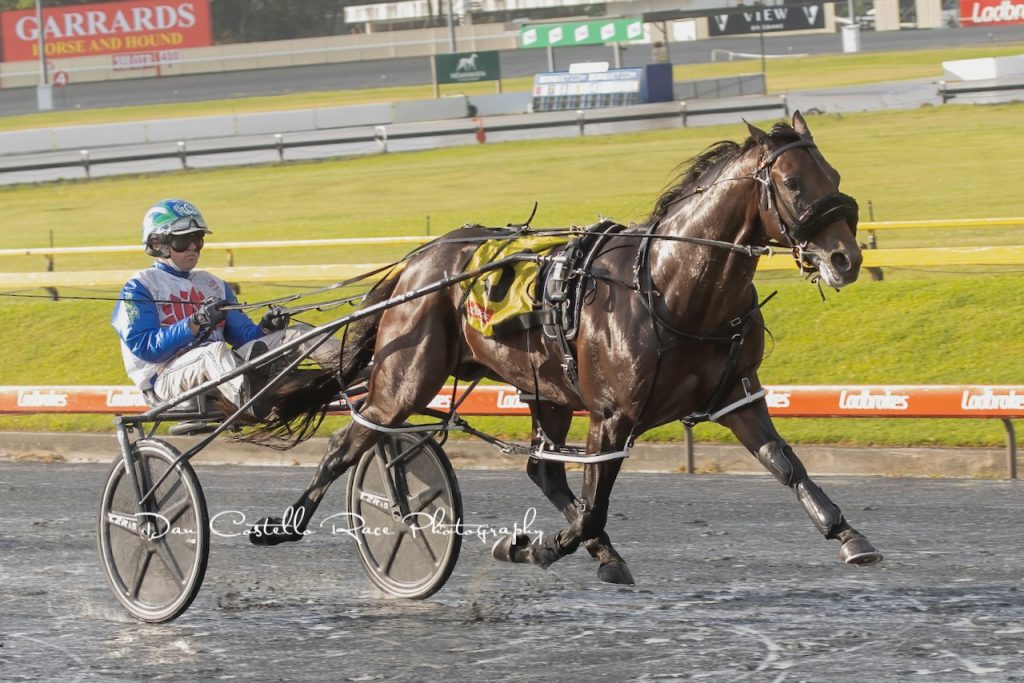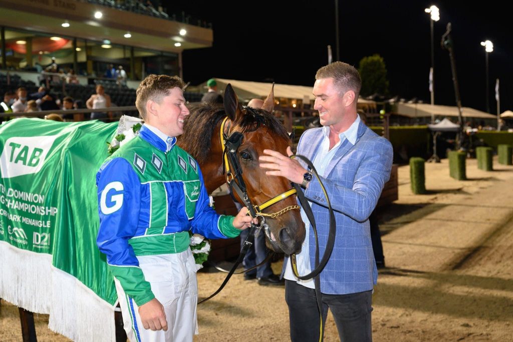 Josh Gallagher seals the 2023 Australasian Young Drivers Championship by 11.3 metres behind the Grant Dixon trained Aroda. DAN COSTELLO PHOTO